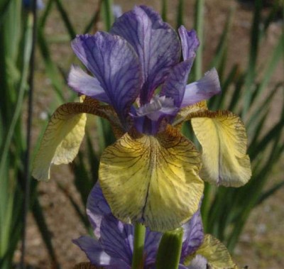 Flowers bi-coloured, standards and style arms medium blue-violet, darker veining and edges. Falls yellow, lighter at edge, darkest at signal, veined blue violet (89A to 90B), darkest at tip, signal yellow, veined deep blue-violet. Plant height 75 cm. height. Unique bi-coloured flowers novelty among sibirica's.