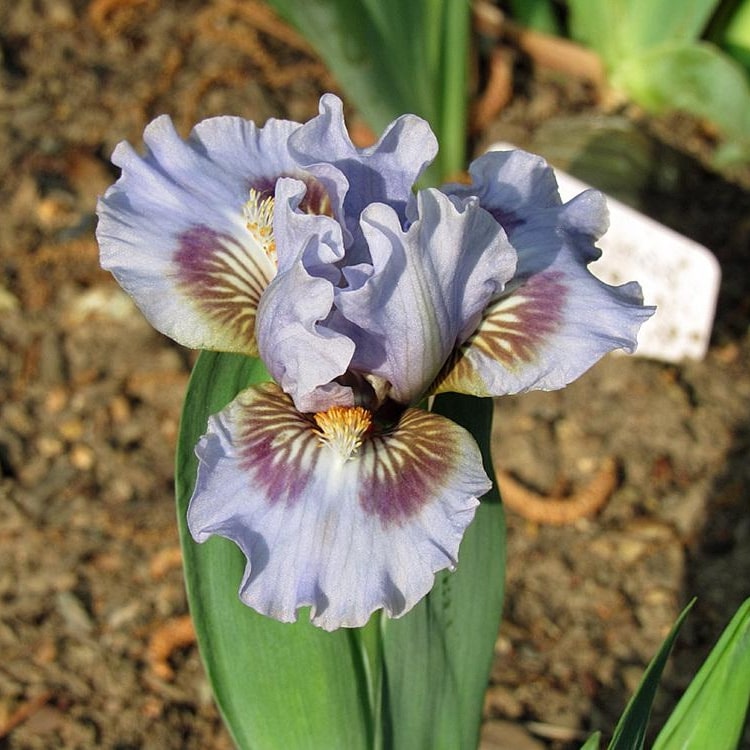 Standards medium violet-blue, falls medium violet-blue, large dark charcoal-plum spot veined wide tan to white, ruffled. Beards orange, white at end. Pronounced spicy fragrance.