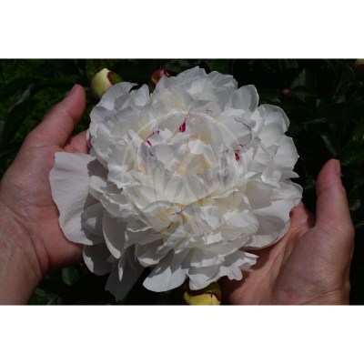 Flowers large, globular, double, pure white with a spot of red on a few central petals. Flowers with delightful fragrance, very floriferous sort. Stems strong, foliage large, dark green.