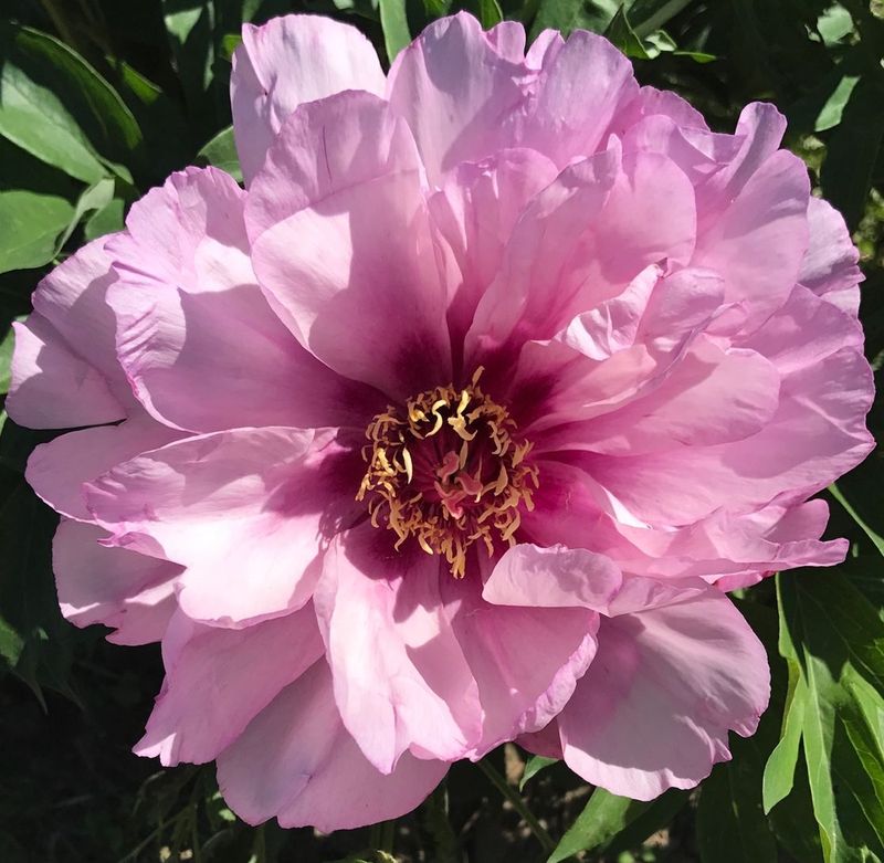 Semi-double to double, very large flowers, lavender pink with darker center. Flowers abundant, situated on top of the dense foliage, slightly scented. Beautiful dark green leaves create superb and compact shrub.